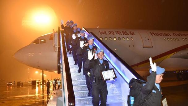 3月12日,在杭州蕭山國際機場,中國第四支赴利比里亞維和警察防暴隊隊員抵達后列隊走下飛機。新華社記者 黃宗治 攝 3月12日,中國第四支赴利比里亞維和警察防暴隊隊員抵達杭州蕭山國際機場后在歡迎儀式上列隊。