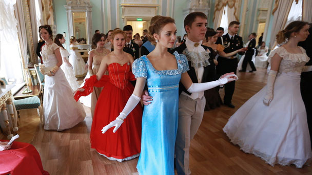 當?shù)貢r間2017年3月15日,俄羅斯圣彼得堡,圣彼得堡年輕人在康斯坦丁宮舉辦復古舞會,重現(xiàn)經典《戰(zhàn)爭與和平》19世紀場景。