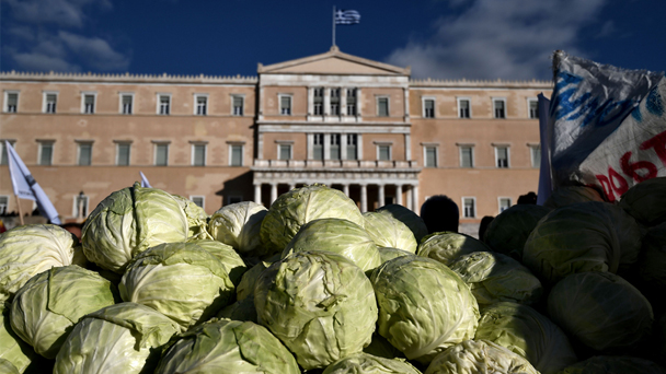 2月14日,希臘農民為反對新稅收措施上街游行,要求減少稅收,增加補貼。