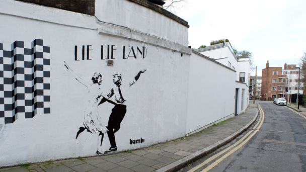 英國涂鴉藝術家芭比改編自電影《愛樂之城》創作的涂鴉《謊言之城》在倫敦街頭出現,不過這里的主角換成了美國總統特朗普與英國首相特雷莎·梅。