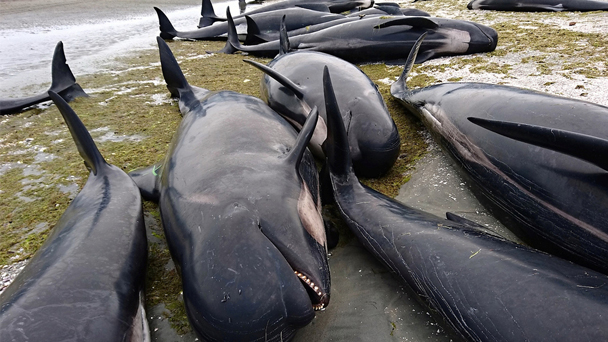 當地時間2月9日,約有400多頭巨頭鯨在新西蘭海灘擱淺。