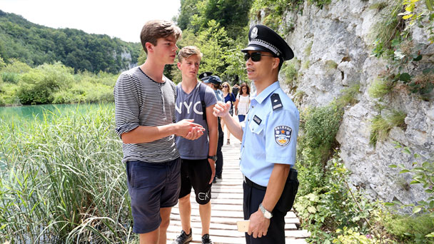 7月26日,中國警察黎倍君在克羅地亞普利特維采湖群國家公園和游客溝通。此次聯(lián)合巡邏為期一個月,6名中國警官與克方警察在杜布羅夫尼克、薩格勒布和普利特維采湖群國家公園三地進行聯(lián)合巡邏,協(xié)助克警方處理與中國游客安全有關的問題,為中國游客與克警方溝通提供便利。