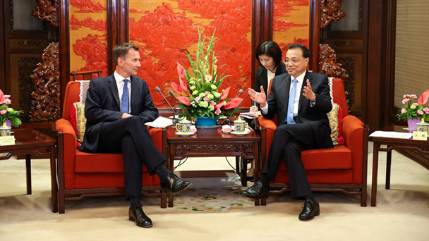 國務院總理李克強7月30日下午在中南海紫光閣會見來華出席第九次中英戰(zhàn)略對話的英國外交大臣亨特。