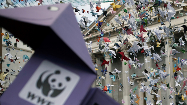 11月24日,世界自然基金會(WWF)在西班牙馬德里議會外放置數千只紙鶴,呼吁當地政府保護科托多尼亞納國家公園。