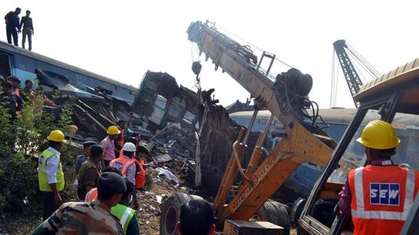 11月20日,救援人員在印度北方邦布克拉揚地區的火車脫軌現場工作。印度警方20日說,一列快速列車當天在印度北方邦布克拉揚地區脫軌,目前死亡人數已升至103人,另有約150人受傷。印度警方20日說,一列快速列車當天在印度北方邦布克拉揚地區脫軌,目前死亡人數已升至103人,另有約150人受傷。