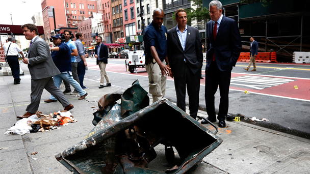 9月18日,紐約曼哈頓爆炸事件中疑似被投放爆炸裝置的垃圾桶曝光,紐約市長(zhǎng)白思豪和紐約州長(zhǎng)安德魯?科默視察現(xiàn)場(chǎng)。