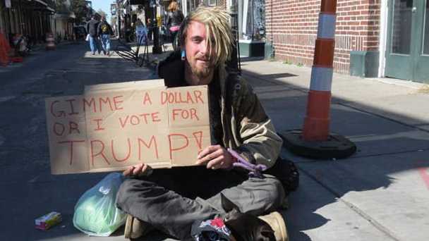 近日,紐約時報廣場附近一名無家可歸者打出一張標語,吸引了不少行人駐足,上面寫著:給我一美元,否則我就投票給特朗普。