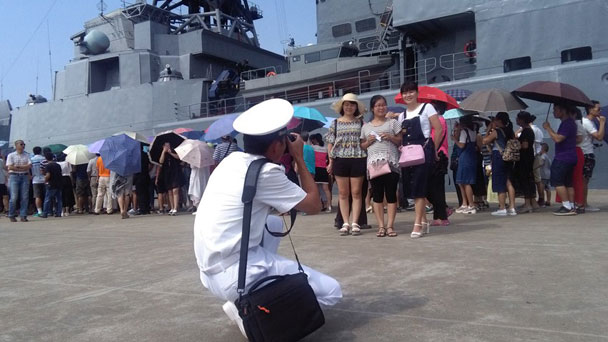 9月14日,參加中俄“海上聯合-2016”軍事演習的部分艦艇向市民開放。期間,湛江市民可以登上俄“特里布茨海軍上將”號反潛艦(564)和中國海軍廣州艦(168)進行參觀。開放日活動吸引了很多市民,大家有秩序地排隊登艦,并與中俄海軍官兵合影留念。
