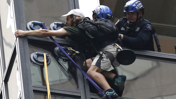 據美國有線電視新聞網10日報道,當天早上一名男子借助幾個巨大的吸盤,爬上紐約特朗普大樓的外墻,最后在警察的“圍追堵截”之下被拉進樓內。