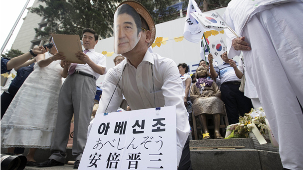 2016年8月15日是韓國光復節71周年紀念日,民眾在首爾鐘路區日本大使館前舉行集會,扮成日本首相安倍晉三跪地謝罪。