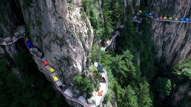 據(jù)了解,當(dāng)日是老君山2016露營節(jié)開幕首日,眾多“驢友”于頭天晚上在懸空棧道上安營扎寨,美夢于云端之上,體驗(yàn)野外別樣樂趣。