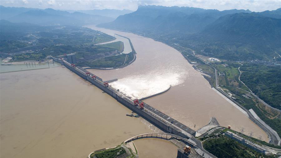 這是7月14日在湖北省宜昌市秭歸縣茅坪鎮拍攝的江水通過三峽大壩泄洪深孔下泄的場景(無人機航拍)。7月13日,長江委水文局發布汛情,長江2018年第2號洪水已在長江上游形成,三峽水庫將迎來今年以來最大洪峰。