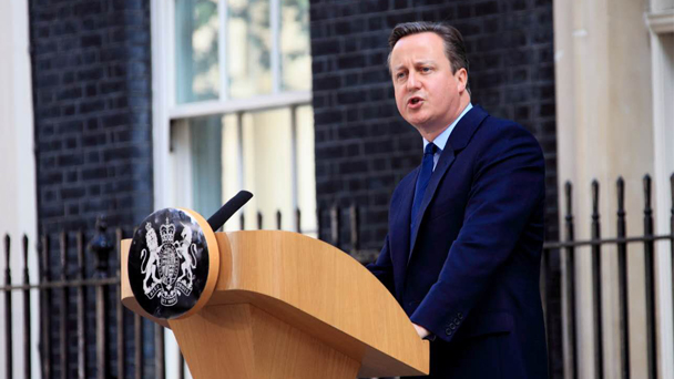 英國當地時間6月24日上午,在脫歐公投結果公布1個多小時后,英國首相卡梅倫在唐寧街10號首相官邸前發表召開發布會,宣布將辭去英國首相一職,英國保守黨將在今年10月選出新任首相。
