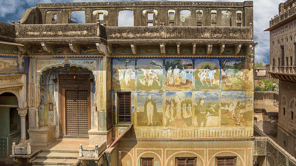 印度拉賈斯坦邦的沙卡瓦蒂雖然坐落于貧瘠的沙漠中,卻是大量印度億萬富翁的發跡地。如今這個小城已經敗落,不過城中豪宅和精美的壁畫仍然時時提醒著游人它往日的輝煌。
