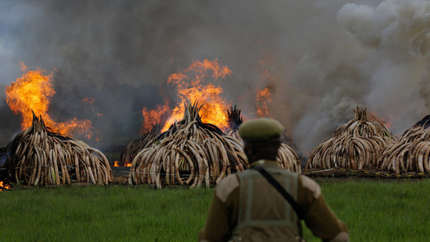 2016年4月30日,肯尼亞總統(tǒng)胡魯·肯雅塔在肯尼亞內(nèi)羅畢國(guó)家公園內(nèi)親手點(diǎn)燃了收繳的105噸象牙和1.35噸犀牛角.