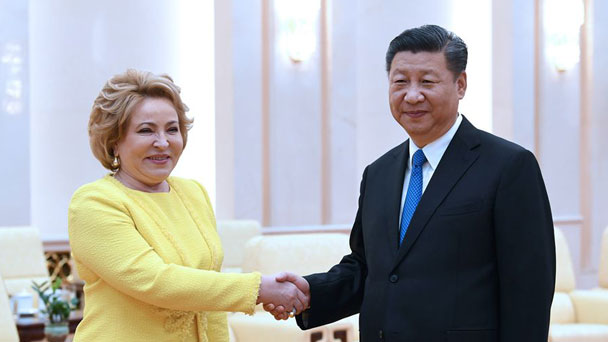 國家主席習近平4日在人民大會堂會見俄羅斯聯邦委員會主席馬特維延科。7月4日,國家主席習近平在北京人民大會堂會見俄羅斯聯邦委員會主席馬特維延科。