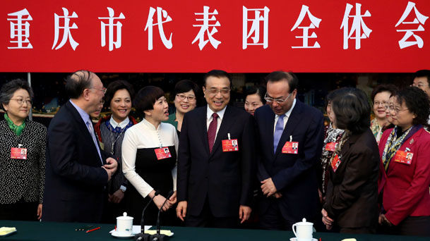 2016年3月8日,中共中央政治局常委、國務院總理李克強參加十二屆全國人大四次會議重慶代表團的審議。現場女代表提議總理會后和女同胞們合影。李克強當即答應,并向在場的所有女代表,以及參加“兩會”的全體女代表委員、工作人員致以三八婦女節問候。