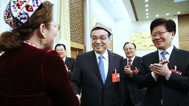 2016年3月10日,中共中央政治局常委、國務院總理李克強參加十二屆全國人大四次會議新疆代表團的審議。這是現場一名維吾爾族女代表為總理獻上一頂維吾爾族傳統花帽“朵帕”。