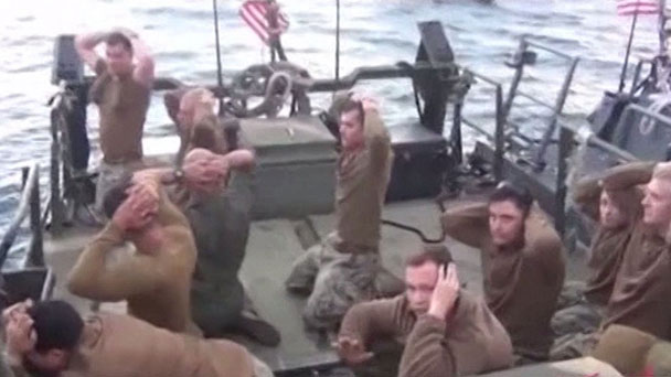 伊朗國家電視臺日前播出一段視頻,10名美國海軍因入侵波斯灣伺機探聽伊朗被捕,他們雙膝下跪,雙手放在背后表示投降。伊朗軍方將他們運送至法爾斯島關押16小時并進行盤問后將其釋放。