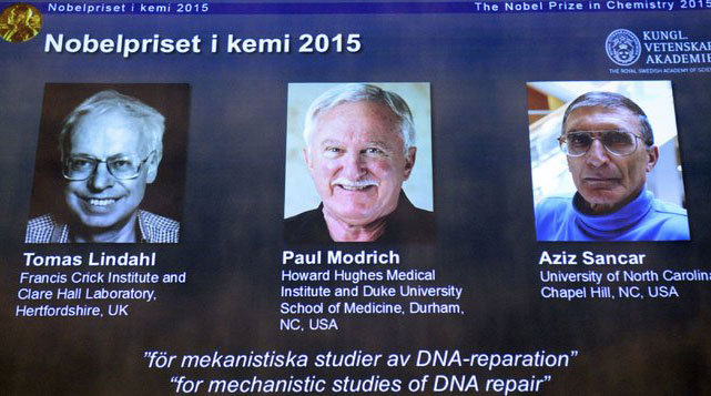 據(jù)諾貝爾獎官網(wǎng)的最新消息,瑞典斯德哥爾摩當?shù)貢r間7日中午11時45分,2015年諾貝爾化學獎在當?shù)氐娜鸬浠始铱茖W學院揭曉,托馬斯?林道爾、保羅?莫德里奇以及阿奇茲?桑卡獲獎。獲獎理由是“DNA修復的細胞機制研究”。