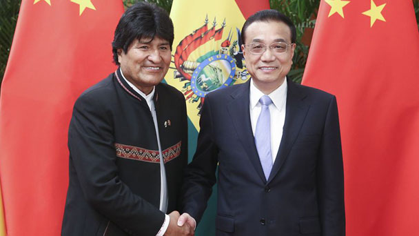 國務院總理李克強19日下午在人民大會堂會見來華進行國事訪問的玻利維亞總統莫拉萊斯。