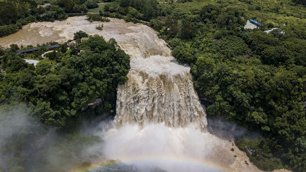 6月20日,游客在黃果樹瀑布參觀游覽。當日,受近期持續降雨影響,貴州黃果樹瀑布迎來2018年入汛以來最大水量,流量達到395立方米/秒。當日,受近期持續降雨影響,貴州黃果樹瀑布迎來2018年入汛以來最大水量,流量達到395立方米/秒。
