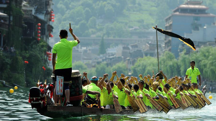 6月18日,在貴州省黔東南苗族侗族自治州鎮遠縣 陽河上,當地群眾在傳統龍舟賽上賽龍舟。新華社發(楊文斌 攝) 6月18日,在貴州省黔東南苗族侗族自治州鎮遠縣 陽河上,當地群眾在傳統龍舟賽上賽龍舟。