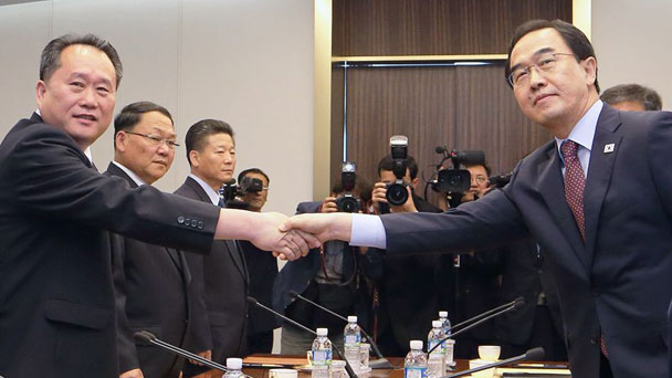 6月1日,在板門店韓方一側(cè)的“和平之家”,韓國統(tǒng)一部長(zhǎng)官趙明均(右)與朝鮮祖國和平統(tǒng)一委員會(huì)委員長(zhǎng)李善權(quán)握手。韓國和朝鮮6月1日在板門店韓方一側(cè)的“和平之家”舉行高級(jí)別會(huì)談,就履行《板門店宣言》的具體方案和后續(xù)措施達(dá)成一致。