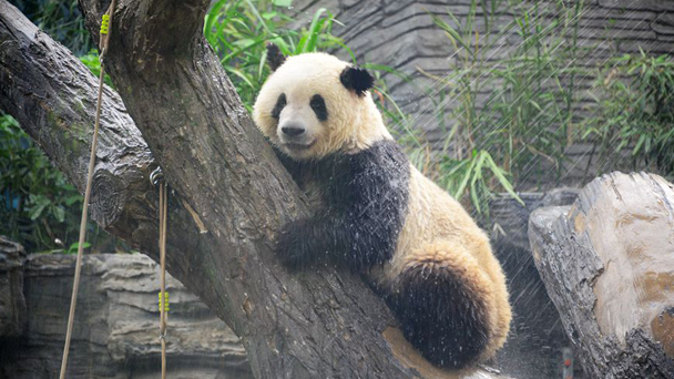 當日,北京出現高溫天氣,北京動物園采取分時段淋浴和噴霧等方式,給大熊貓防暑降溫。
