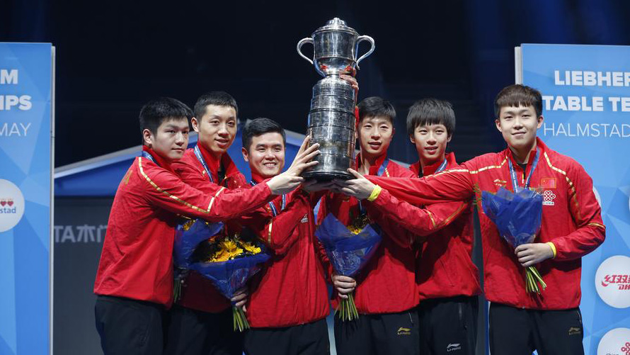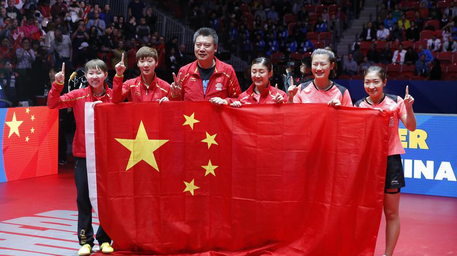 5月5日,中國隊隊員和教練李隼(左三)慶祝奪冠。當日,在瑞典哈爾姆斯塔德舉行的2018年乒乓球世界團體錦標賽女團決賽中,中國隊以3比1戰勝日本隊,奪得冠軍。當日,在瑞典哈爾姆斯塔德舉行的2018年乒乓球世界團體錦標賽女團決賽中,中國隊以3比1戰勝日本隊,奪得冠軍。