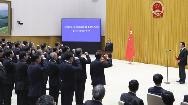 4月16日,新一屆國務院在北京中南海舉行憲法宣誓儀式。國務院總理李克強監誓。