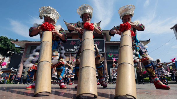 4月17日,在廣西融水苗族自治縣舉行的“壯族三月三·體育民族炫”系列活動開幕式上,少數民族同胞參加拉苗鼓比賽。