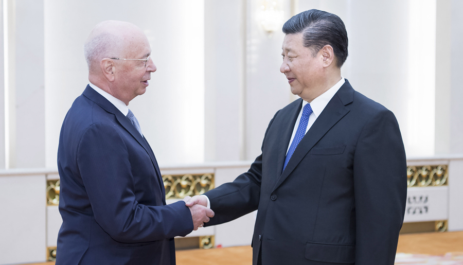 4月16日,國家主席習近平在北京人民大會堂會見世界經濟論壇主席施瓦布。