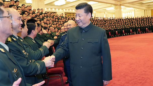 2月2日,中共中央總書記、國家主席、中央軍委主席習近平在北京接見武警部隊第三次黨代表大會全體代表。這是習近平同代表們親切握手。