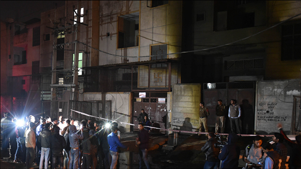 1月20日,在印度首都新德里巴瓦納工業(yè)園,人們聚集在發(fā)生火災(zāi)的一家煙花廠外。印度首都新德里一家煙花廠20日突發(fā)大火,已造成至少17人喪生、多人受傷。