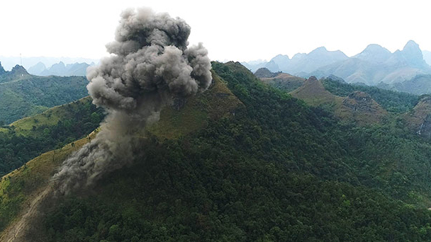 掃雷官兵手拉手走過完成清理的中越邊境廣西段某雷場(12月22日攝)。新華社記者 周華 攝 掃雷隊在中越邊境廣西段某雷場引爆炸藥,以清除雷場植被,方便后期搜排(12月22日攝)。新華社記者 周華 攝 在中越邊境廣西段某雷場,掃雷官兵進入爆破作業后的區域進行搜排(12月22日攝)。