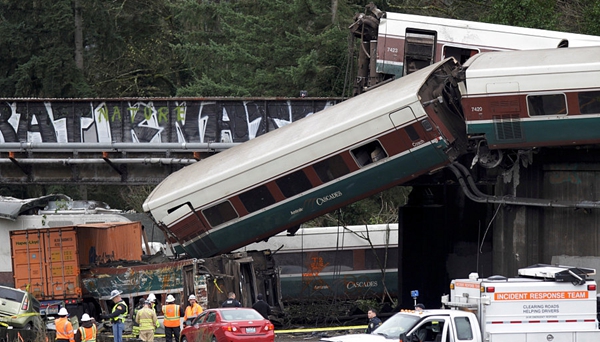 當地時間12月18日,美國全國鐵路客運公司一列客車在華盛頓州塔科馬以南的一座橫跨公路的高架橋上意外脫軌,目前已導致6人死亡,77人受傷。