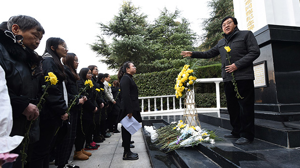 12月11日,侵華日軍南京大屠殺遇難同胞紀(jì)念館原館長朱成山(右一)向?qū)W生、市民講述日軍在南京草鞋峽等沿江地區(qū)屠殺我同胞的歷史。新華社記者 孫參 攝 12月11日,南京曉莊學(xué)院大學(xué)生在“侵華日軍南京大屠殺草鞋峽遇難同胞紀(jì)念碑”前誦讀《祭南京殤胞文》。