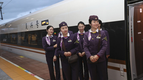 2017年11月20日,浙江蒼南始發浙江第一列“復興號”G7350次列車,蒼南始發站工作人員接橫幅慶祝。2017年11月20日,浙江蒼南始發浙江第一列“復興號”G7350次列車,蒼南始發站工作人員接橫幅慶祝。