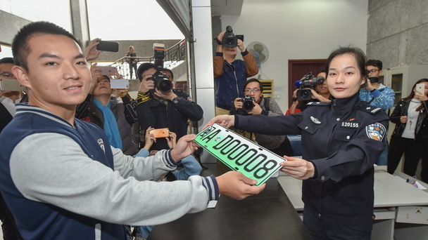 11月20日,在福州市交警支隊車輛管理所,民警向市民林先生發放當地第一張新能源汽車專用號牌。11月20日,在福州市交警支隊車輛管理所,工作人員在現場制作第一批新能源汽車專用號牌。