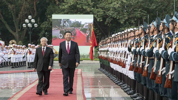 中共中央總書記、國家主席習近平12日在河內越共中央駐地同越共中央總書記阮富仲舉行會談。雙方積極評價彼此發展成就,一致同意繼承、維護、發揚好中越傳統友誼,相互堅定奉行友好政策,把兩國全面戰略合作發展得越來越好,給兩國和兩國人民帶來更多切實利益。