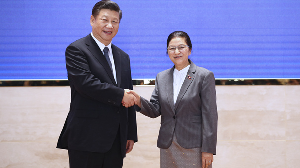 11月14日,中共中央總書記、國家主席習近平在萬象國家會議中心會見老撾國會主席巴妮。