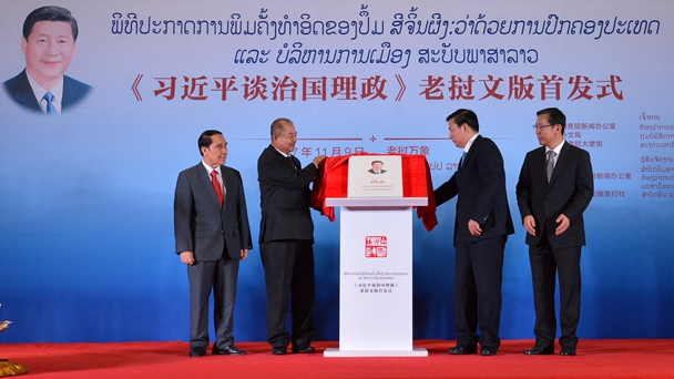11月9日,在老撾首都萬象,中國(guó)國(guó)務(wù)院新聞辦公室副主任郭衛(wèi)民、老撾人民革命黨中央書記處書記、中宣部長(zhǎng)吉喬等出席《習(xí)近平談治國(guó)理政》老撾文版首發(fā)式。