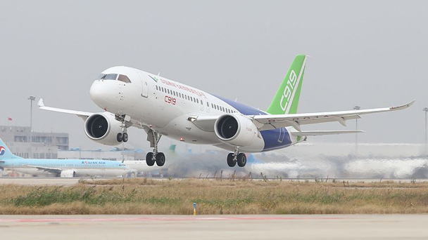 2017年11月10日,上海,國(guó)產(chǎn)大飛機(jī)C919起飛前往西安閻良。這是C919的首次遠(yuǎn)距離飛行。