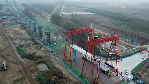6日,北京軌道交通新機場線第一片梁,在位于大興區禮賢鎮由北京城建集團承建的新機場線一期工程02標工地開始架設,這標志著北京新機場線進入高架區間上部結構施工。