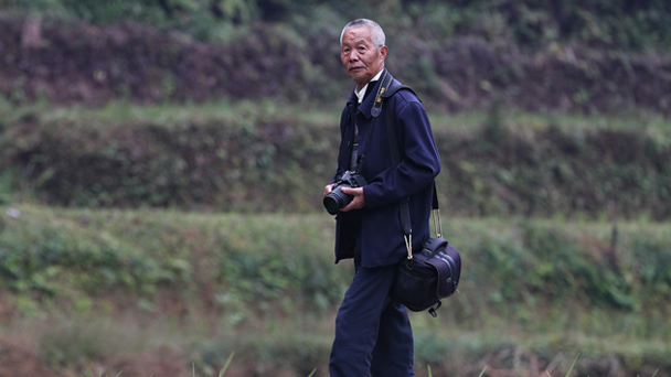 78歲的張希才老人是貴州省雷山縣西江鎮黃里村人,在當地可是名人。圖為11月7日,張希才老人胸前掛著相機走在采訪的路上。