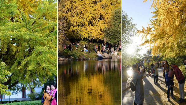 10月29日,人們在北京大學未名湖畔的一棵銀杏樹下拍照。深秋的北京大學在色彩斑斕的樹葉妝點下格外美麗。