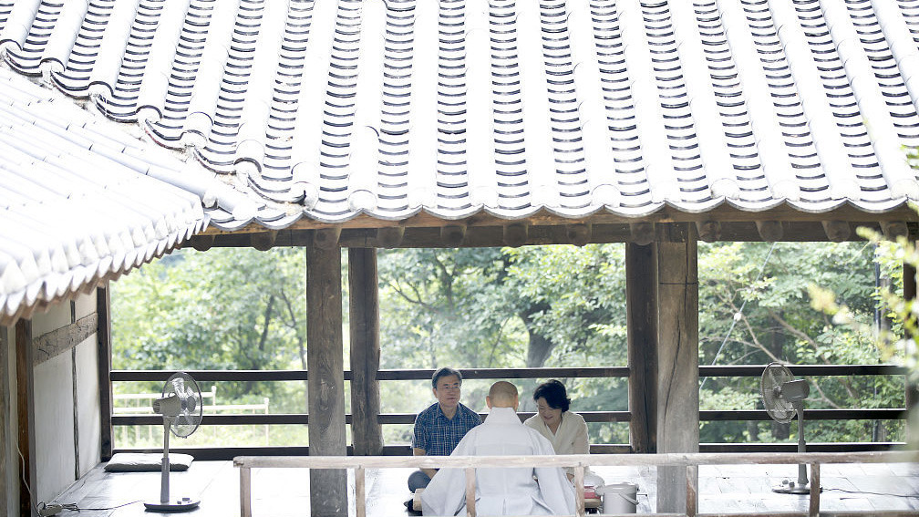 當地時間2018年7月28日,韓國慶尚北道,韓國總統文在寅偕夫人金正淑現身當地度周末,造訪寺廟,并與寺廟住持喝茶暢談。