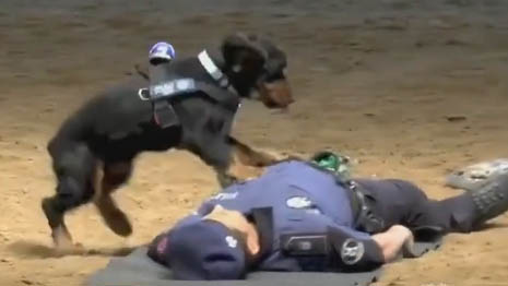 西班牙馬德里的警察在推特上公布一段視頻。視頻中,一名警察假裝暈倒在地,這時曾接受過心臟復蘇警犬龐喬(音)飛奔到奄奄一息的警官身邊,對其進行施救。