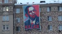 在這個高達30英尺(約合9米)的橫幅上,正中間是奧巴馬的頭像,下方配有紅色的Killer字樣。橫幅的大塊區域是血紅色的,觸目驚心。